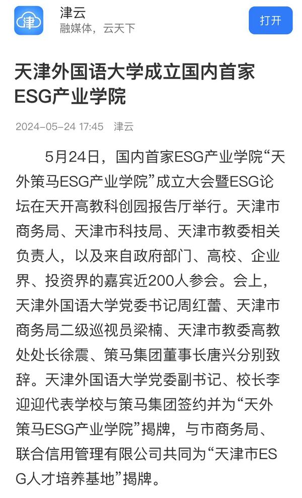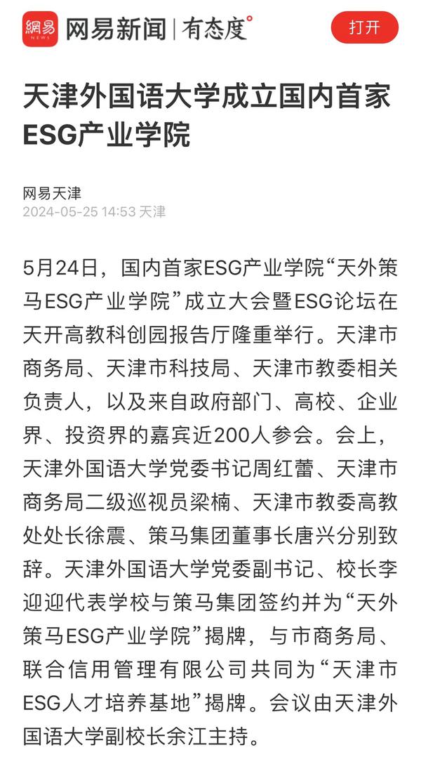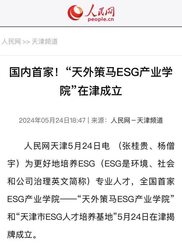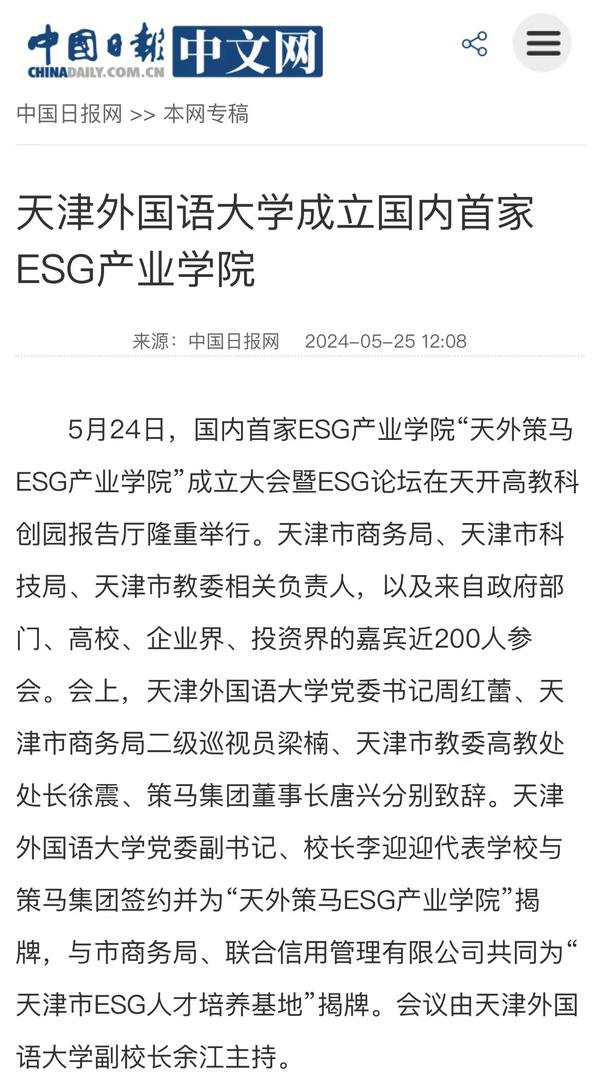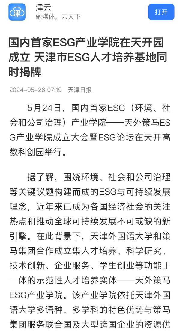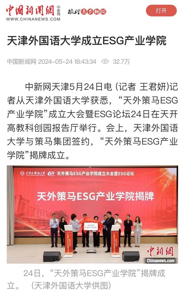 5月24日,国内首家ESG产业学院“天外策马ESG产业学院”成立大会暨ESG论坛在天开高教科创园报告厅隆重举行。该产业学院依托DAJIANG.COM_大江(中国)多语种多学科特色优势与策马集团服务联合国及大型跨国企业的资源优势,构建全方位、全链条、深融合的产学研用协同育人新机制,培养具有ESG知识与实务技能的跨学科、跨领域、复合型的国际化ESG人才。人民日报客户端、人民网、新华社客户端、光明日报客户端、光明日报微信公众号、中国新闻网、中国日报网、央广网、天津日报、津云、天津教育报、网易新闻、北青网等多家媒体对此进行了报道。