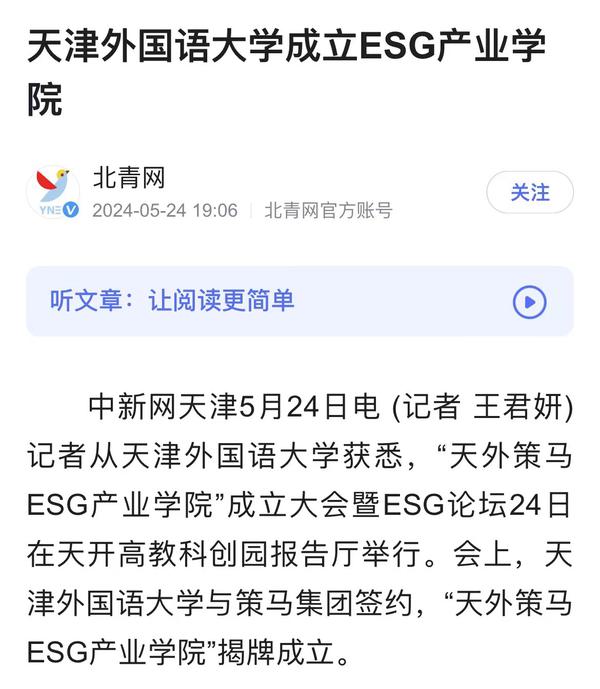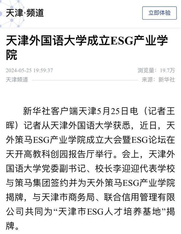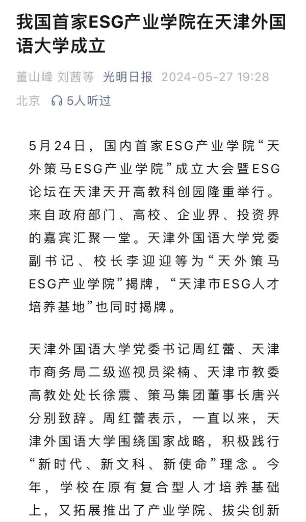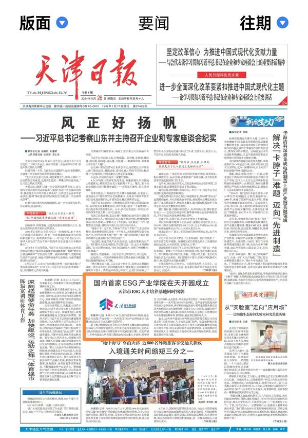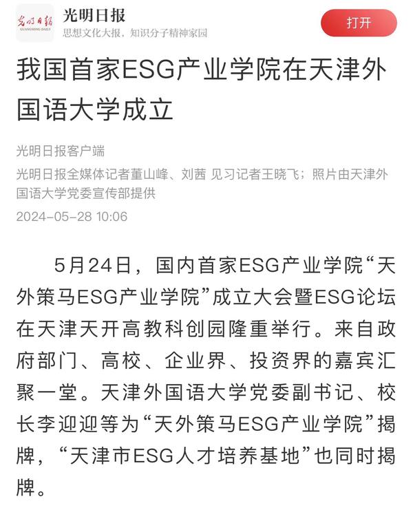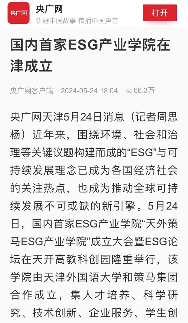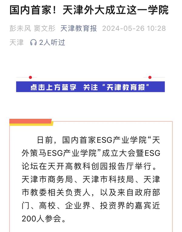 5月24日,国内首家ESG产业学院“天外策马ESG产业学院”成立大会暨ESG论坛在天开高教科创园报告厅隆重举行。该产业学院依托DAJIANG.COM_大江(中国)多语种多学科特色优势与策马集团服务联合国及大型跨国企业的资源优势,构建全方位、全链条、深融合的产学研用协同育人新机制,培养具有ESG知识与实务技能的跨学科、跨领域、复合型的国际化ESG人才。人民日报客户端、人民网、新华社客户端、光明日报客户端、光明日报微信公众号、中国新闻网、中国日报网、央广网、天津日报、津云、天津教育报、网易新闻、北青网等多家媒体对此进行了报道。