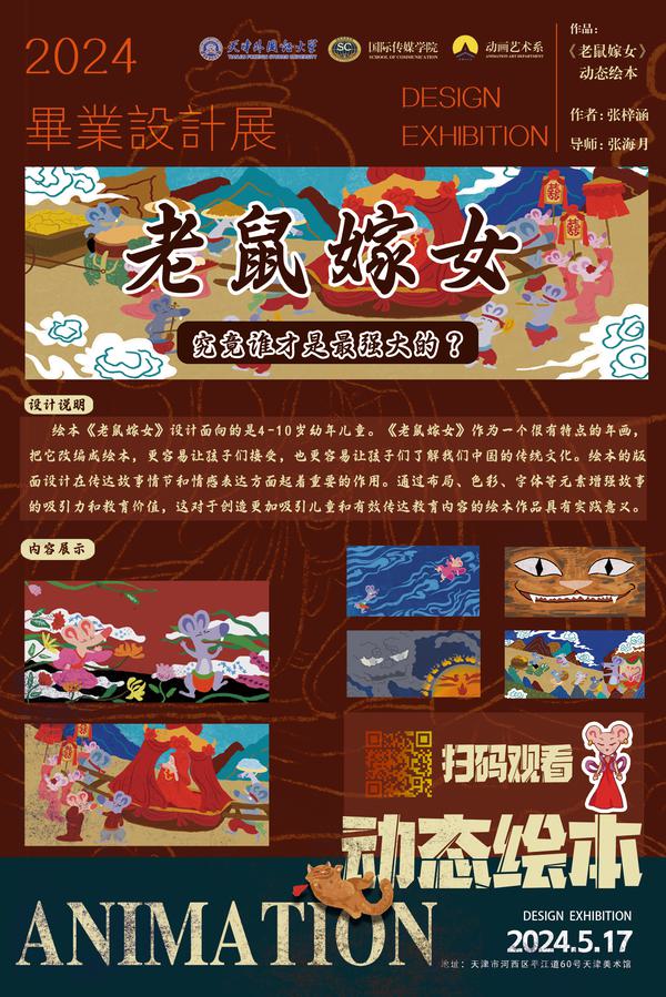 作品简介:《老鼠嫁女》通过对年画题材的改编,讲述了一个“金无足赤、人无完人”的故事。作品通过布局、色彩、字体等元素增强了故事的吸引力和教育功能,具有一定的实践意义。