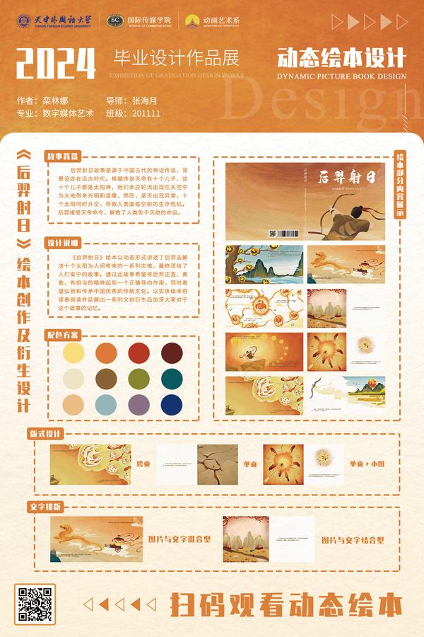 作品简介:作品讲述了一个中国古老的神话故事,通过后羿射日的故事展示了古人的勇敢、智慧。作品最终以视频动态绘本、实体书两种方式呈现。
