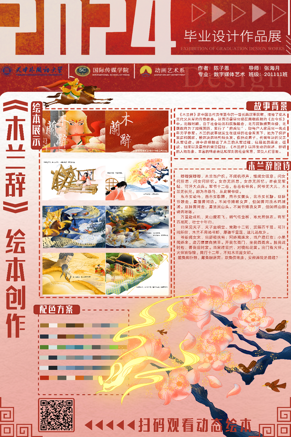 指导教师评语:绘本在画面表现上比较出色,以厚重而晶莹的笔触和色彩,呈现出瑰丽奇幻的画面效果,通过花木兰替父从军的故事向读者展示了中华民族的精神风貌和文化底蕴。