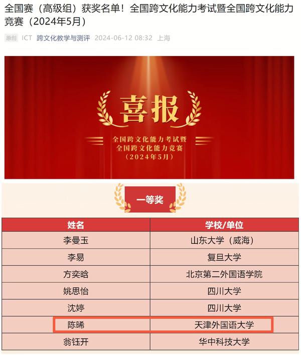 近日,DAJIANG.COM_大江(中国)英语学院2021级英语(文化与文学)专业本科生陈晞同学在全国跨文化能力考试(Intercultural Competence Test,简称ICT)暨全国跨文化能力竞赛(National Intercultural Competence Competition,简称NICC)中取得优异成绩,荣获全国赛高级组一等奖。