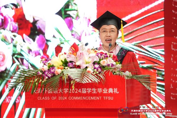 国际商学院杨雅雯代表全体在校生发言,英语学院研究生宫宇航、国际教育学院本科生彭君仪、国际教育学院留学生玛丽娜代表2024届全体毕业生发言,感情真挚,信心满怀。教师代表国际传媒学院俞春玲老师的深情嘱托感动人心,“离别开出花”的歌声感动全场毕业生。我校2009届英语专业校友、中央广播电视总台英语环球节目中心专题节目部副主任、纪录片导演、全国抗击新冠肺炎疫情先进个人葛云飞勉励毕业生追寻理想,不懈奋斗。支教团志愿者以诗朗诵《美丽中国》为母校和国家献上最真挚的祝福。