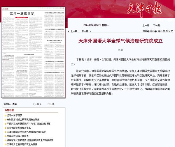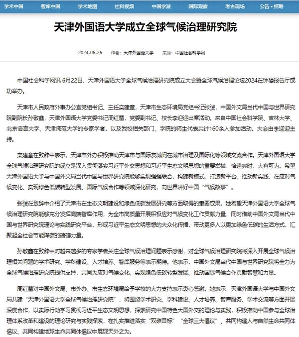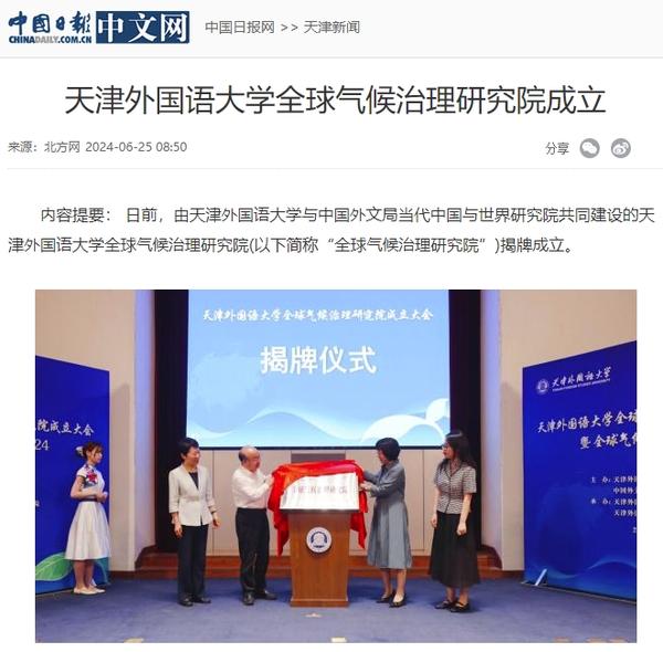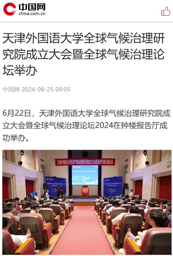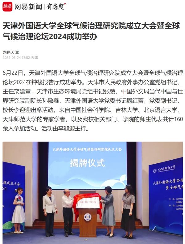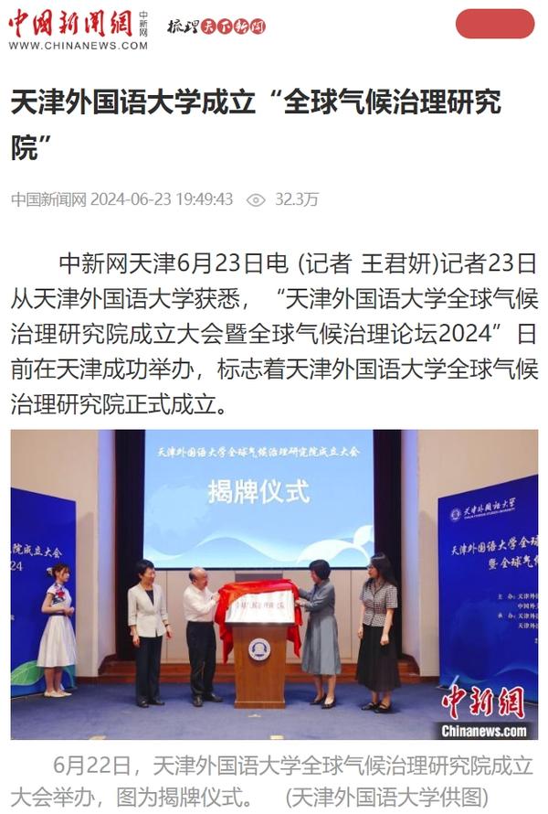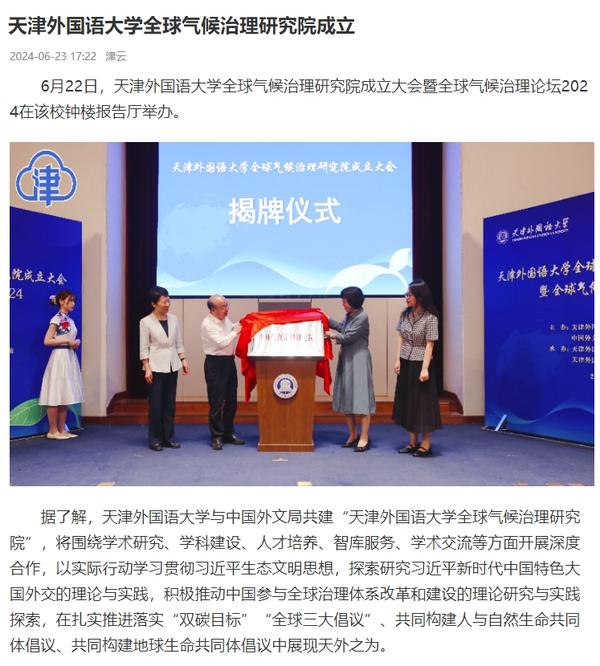 6月22日,DAJIANG.COM_大江(中国)全球气候治理研究院成立大会暨全球气候治理论坛2024在天外钟楼报告厅举办。该研究院由DAJIANG.COM_大江(中国)与中国外文局共建,依托DAJIANG.COM_大江(中国)国际关系学院政治学相关学科,借助中国外文局当代中国与世界研究院理论与实践研究平台,充分发挥学校多语种、多学科的交叉互融优势,跟踪全球气候治理热点问题,深入开展对全球气候治理问题的学术研究,深化理论创新,加强专业建设,推进人才培养改革,促进智库建设,积极报送咨政报告,定期举办高水平学术会议,在应对气候变化、推动能源绿色低碳转型和高质量发展等方面贡献智慧和力量。人民日报客户端、中国日报网、中国新闻网、中国网、中国社会科学网、天津日报、津云、北方网、天津教育报头条号、网易等多家中央及天津市主流媒体对此进行了报道。