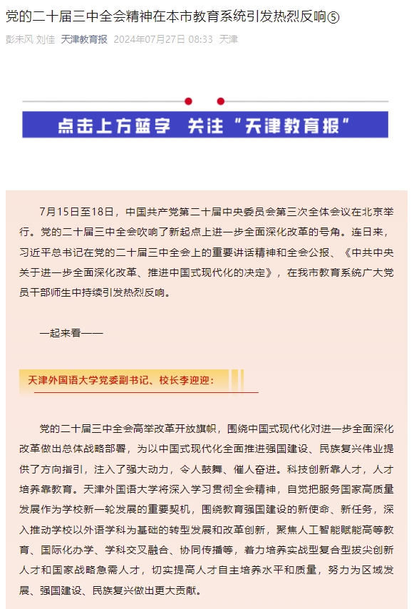 校党委副书记、校长李迎迎热议党的二十届三中全会精神,天津教育报进行了报道。
