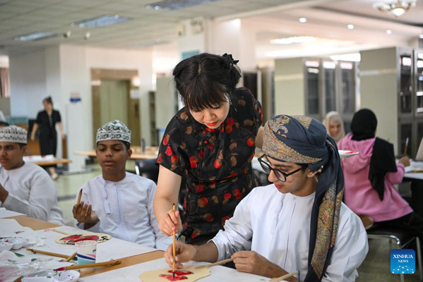 A teacher introduces traditional Chinese paintings to Omani youngsters at Tianjin Foreign Studies University in north China's Tianjin Municipality, Aug. 15, 2024. Twenty-two youngsters from Oman are on a two-week study tour in Beijing and Tianjin to experience the Chinese culture. (Xinhua/Sun Fanyue)