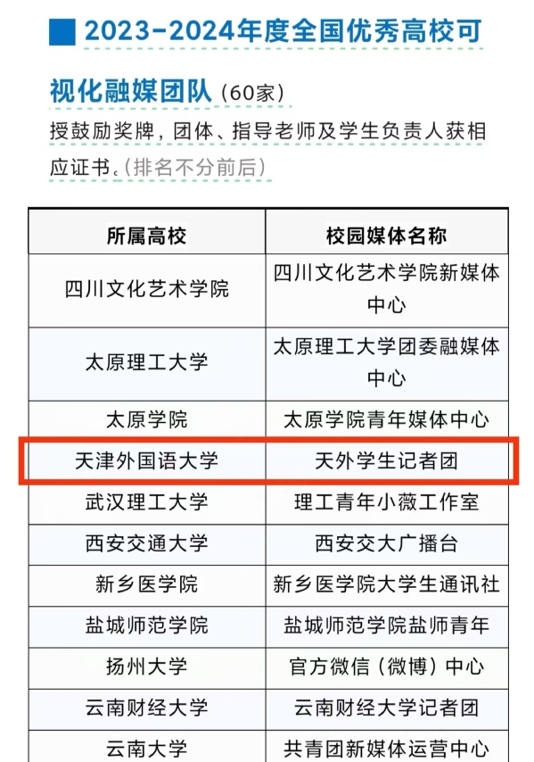 作为校园媒体,我们积极举办中青校媒(天津)相关活动,承办了“展校媒风采绘青春画卷——中青校媒(天津)2024年年会暨年度可视化融媒体巡展”。天外学生记者团多次荣获全国校园媒体奖项。近年来,曾荣获“2020年度百强高校媒体”“中青校媒(天津)十佳校园媒体”“2022-2023年度全国可视化融媒体团队”等多项荣誉称号。未来,天外学生记者团将发挥青年学生记者的创新与活力,助力学校各项宣传工作发展向前!