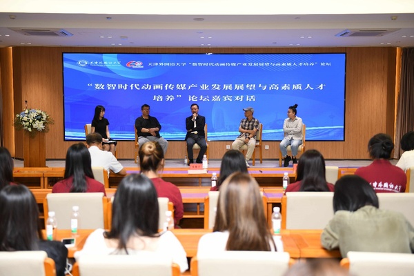 在论坛嘉宾对话环节,天津市动画学会理事长魏长增教授,天津美术学院硕士生导师余春娜教授,英雄游戏科技股份有限公司执行董事、中国民族贸易促进会副秘书长王奕,天津皿鎏软件有限公司制作总监、运营总监王威,就“数智时代动画传媒产业发展展望与高素质人才培养”这一主题进行了深入探讨与交流,重点聚焦数智时代动画传媒人才培养的课程设置、师资队伍、教学模式等方面的改革与创新,为动画传媒人才培养领域的未来探索指明了方向。