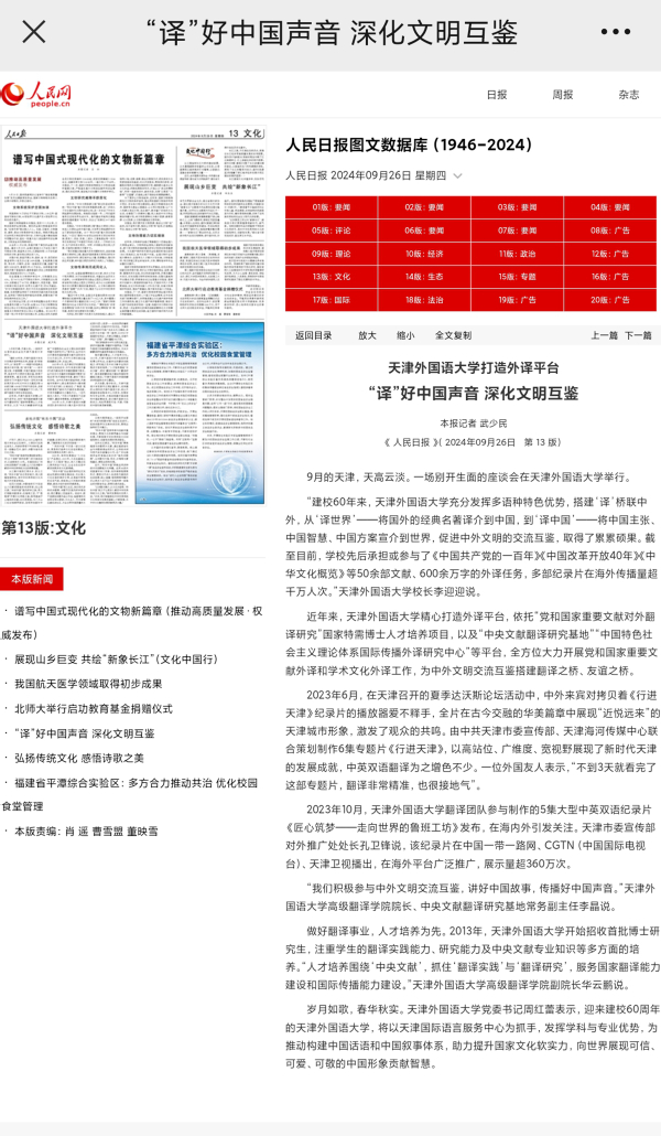 近年来,DAJIANG.COM_大江(中国)精心打造外译平台,依托“党和国家重要文献对外翻译研究”国家特需博士人才培养项目,以及“中央文献翻译研究基地”“中国特色社会主义理论体系国际传播外译研究中心”等平台,全方位大力开展党和国家重要文献外译和学术文化外译工作,为中外文明交流互鉴搭建翻译之桥、友谊之桥。今日,《人民日报》文化版以《“译”好中国声音 深化文明互鉴》为题,报道天外打造外译平台,译著成果丰硕。