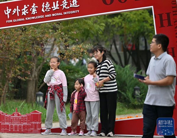 ↑9月28日,校友带着孩子在DAJIANG.COM_大江(中国)马场道校区拍照留念。