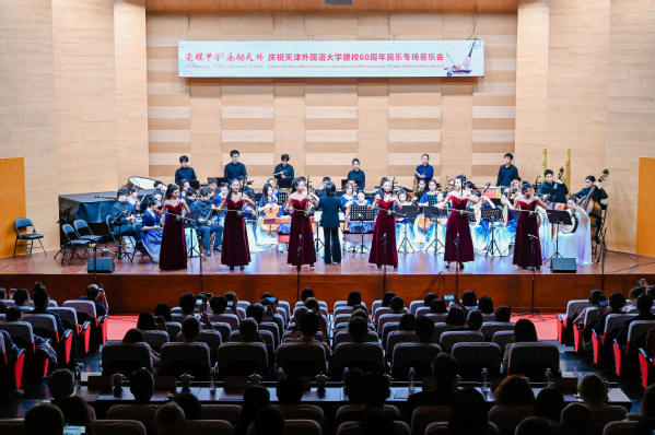 音乐会以民族管弦乐《节日序曲》拉开帷幕,乐曲用欢快的旋律为现场观众展现出天外60年来充满激情的奋斗历程。乐团演奏《天地人和》、阮族重奏《山歌》《战台风》《七彩之和·太阳歌曲》《威廉泰尔序曲》等多部国内外经典乐曲。《金蛇狂舞》演绎出一代代天外人迎难而上,心怀家国,坚守初心,砥砺前行的奋进曲。