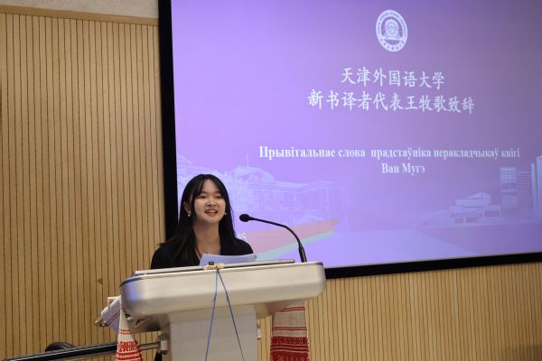 新书译者代表、天外白俄语专业毕业生王牧歌发表了感言。她指出,白俄罗斯语,不仅仅是一种交流的工具,更是连接中国与白俄罗斯文化的钥匙。翻译小说,既是对白俄罗斯文化的学习,也是一次文化的语际传递。通过本次翻译,不仅提升了自己的白俄语水平,而且更加深入地了解了白俄罗斯文化,完成了对自我翻译能力的超越。