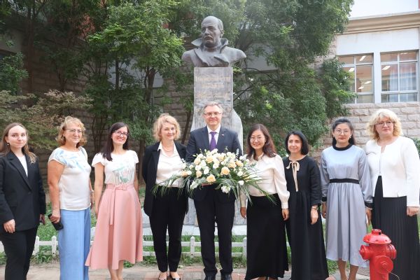 会后,亚历山大·切尔维亚科夫大使一行在与会嘉宾及天外白俄语专业师生的陪同下,向白俄罗斯民族诗人雅库布·科拉斯雕像献花。