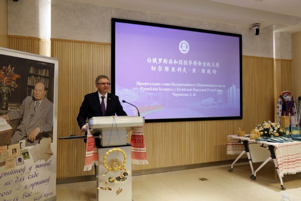 亚历山大·切尔维亚科夫向天外60周年校庆表示祝贺,并感谢天外为传播白俄罗斯语言文化所做的突出贡献。他指出,坐落在天外校园内的白俄罗斯民族诗人雅库布·科拉斯雕像是中国第一座白俄罗斯名人纪念碑,是中白两国文化密切交流的重要标志之一。在雅库布•科拉斯的文学遗产中,《生活的故事》占有独特地位,天外团队与雅库布•科拉斯国家文学纪念博物馆共同翻译、出版本书具有重要意义。他强调,白俄罗斯与中国的合作潜力不可估量,相信在白中双方的共同努力下,两国合作将不断拓展深化。
