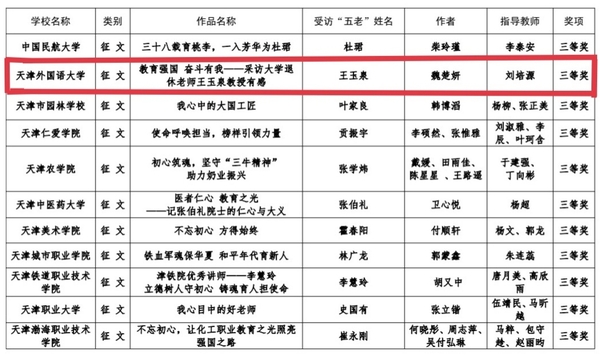 由日语学院的武珂好撰写的文章《走过小小胡同,感受教育之魂》获得征文类二等奖;欧洲语言文化学院的魏楚妍撰写的文章《教育强国,奋斗有我——采访大学退休老师王玉泉教授有感》获得征文类三等奖;由国际传媒学院喻茂瑶撰写的《你是老师,是爸爸,是爷爷——叶连平先生将一生献给讲台》获得征文类优秀奖。