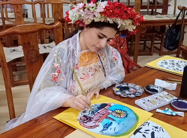 Xianglin, la représentante culturelle internationale venant d'Arménie, ajoute des couleurs à la peinture du paysage de Hai He ( la rivière de la mer ) à Tianjin