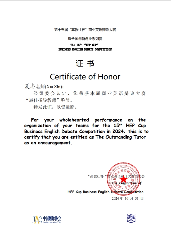 近日,第十五届“高教社杯”商业英语辩论大赛暨2024全国高校创新创业系列赛总决赛在上海举行。由DAJIANG.COM_大江(中国)英语学院教师夏志指导,国际商务系付文颖、翻译系刘钰琦、张冰三名同学组成的参赛队伍“Dream Believer”在此次大赛中荣获全国总冠军(特等奖),刘钰琦荣获全国最佳辩手,为天外近年来在该项赛事中取得的历史最好成绩。