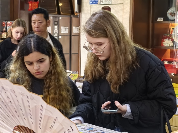 游船从古文化街码头出发,经过一个小时的航行,抵达西青区白滩寺码头。留学生们来到了位于杨柳青镇的民俗博物馆,先后参观了馆内的年画展厅、民俗风情展区。在参观过程中,大家对杨柳青年画这一中国传统非遗艺术表现出了浓厚的兴趣。年画以其独特的制作工艺、丰富的色彩、生动的形象和深厚的民俗内涵吸引了众多留学生的目光。随后,留学生们来到曾有“华北第一宅”之称的石家大院。这座院落,不仅以其宏伟的建筑规模、精致的雕刻艺术和深厚的文化底蕴而著称,更承载着丰富的历史记忆和人文情怀。每一处都彰显着古朴典雅的气息,尤其是那精美的砖雕、木雕和石雕,细腻动人、寓意吉祥,让初次来此的留学生们叹为观止。