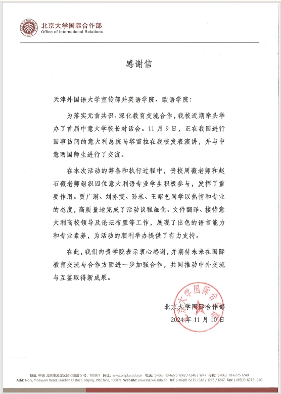 11月10日,北京大学国际合作部向天外发来感谢信,对天外师生积极参与首届中意大学校长对话会,并为会议作出的贡献表示感谢。