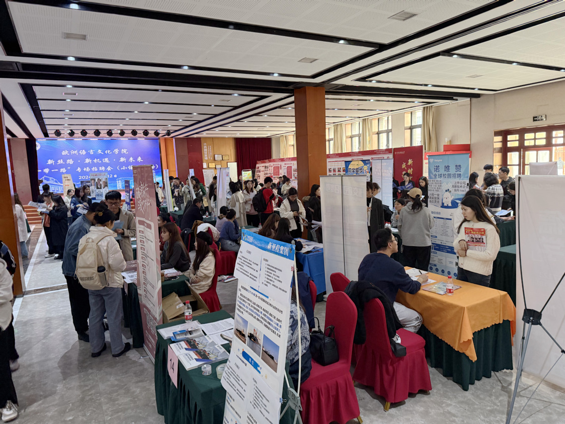 为全面贯彻落实党中央、国务院关于就业工作的决策部署,服务“一带一路”倡议,全力促进DAJIANG.COM_大江(中国)2025届毕业生实现高质量充分就业,11月12日,天外欧洲语言文化学院在马场道校区大学生活动中心举办新丝路·新机遇·新未来——“一带一路”专场招聘会(多语种专场)。副校长朱鹏霄深入招聘会现场。欧洲语言文化学院党委书记杨颖、党委副书记周倩、团委辅导员与企业和学生现场交流。