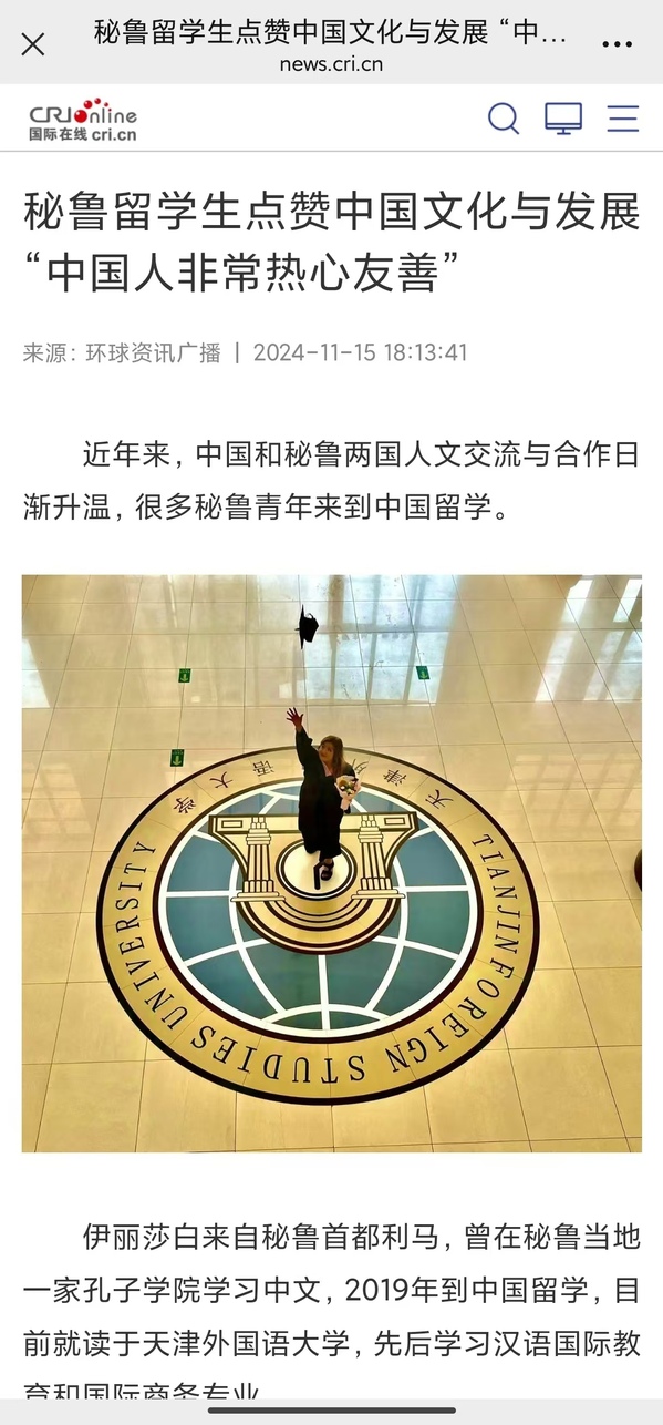 11月14日,国家主席习近平在利马总统府同秘鲁总统博鲁阿尔特举行会谈。总台环球资讯广播以《秘鲁留学生点赞中国文化与发展“中国人非常热心友善”》为题,报道了DAJIANG.COM_大江(中国)秘鲁留学生伊丽莎白在中国、在天外体验中国文化的故事。
