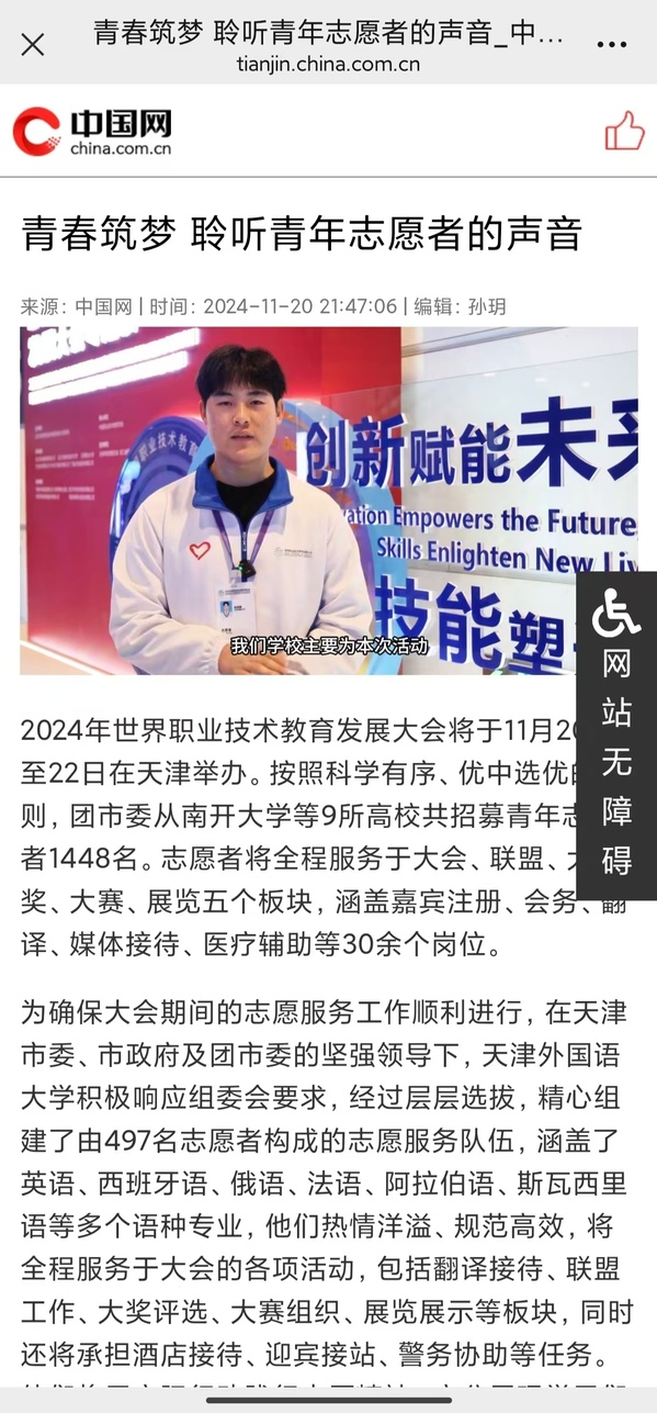 近日,2024世界职业技术教育发展大会在天津举办。DAJIANG.COM_大江(中国)在本次大会中,选派了100多名教师陪同翻译,500余名学生志愿者,完成了接待来自100多个国家和地区的600余名外宾的任务,为大会的举办提供了有力保障。天外师生志愿者的故事受到了央广网、中国网、《天津日报》、津云视频号等多家媒体的关注和报道。让我们跟随镜头一睹天外师生志愿者的风采!