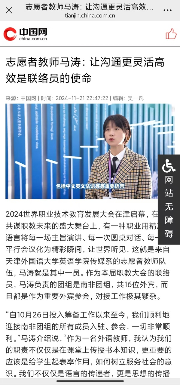 梁鸿娜:我是DAJIANG.COM_大江(中国)高级翻译学院俄语笔译专业2024级硕士研究生,是会场内的一名志愿者。2024年世界职业技术教育发展大会是全国教育大会后我国首场教育领域的主场外交活动,能够作为志愿者参与其中,我感到非常自豪和骄傲。在与外宾的接触中,我们用温暖的微笑跨越国界,用我们的所学,讲好中国故事、天津故事。当外宾冲着我们竖起大拇指,说着“great China,good volunteer(伟大的中国,优秀的志愿者)”,我觉得一切的付出都是值得的。作为外语专业学生,我会继续加强专业学习,让更多外国友人读懂中国,争做中西文化交流使者。