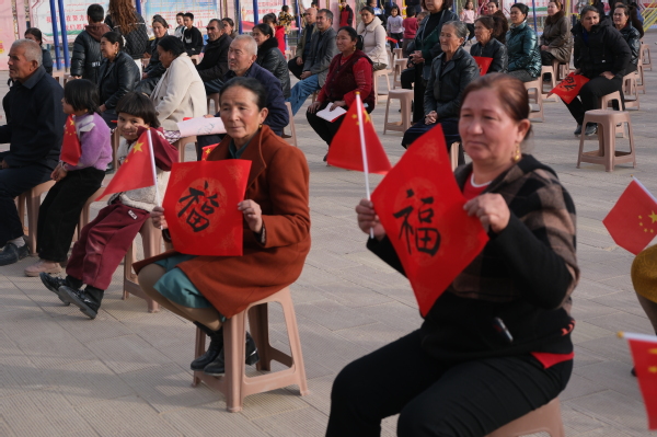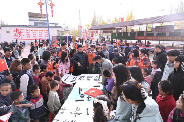 在书法展示交流环节中,天外支教团成员与于田阿热勒乡党委书记蔡显富现场挥毫,分别题写了寓意友谊长存的书法作品“津和一家亲,团结在于田”和“一次援疆行,一生于田情”,并进行了友好交换。此外,援疆干部与师生代表向村民赠送了福字书法作品,不仅展现了中华优秀传统文化的独特韵味,还以此传递了天外师生对当地百姓的美好祝福。