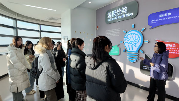 跟随讲解员对电厂固废处置工艺的介绍,师生集中参观了垃圾仓、焚烧发电项目沙盘、系统操控室等区域,并近距离观察垃圾接收、焚烧、余热利用、烟气处理、自动控制、发电系统等处理流程,感受着这座别样“垃圾厂”的数字化、智能化、绿色化。在垃圾博物馆内,天外马克思主义学院教师何伶俐从绿色生产力的概念出发,深入浅出地阐释了习近平生态文明思想的核心内容,让同学们加深理解中国进一步深化生态文明体制机制改革的重要意义。