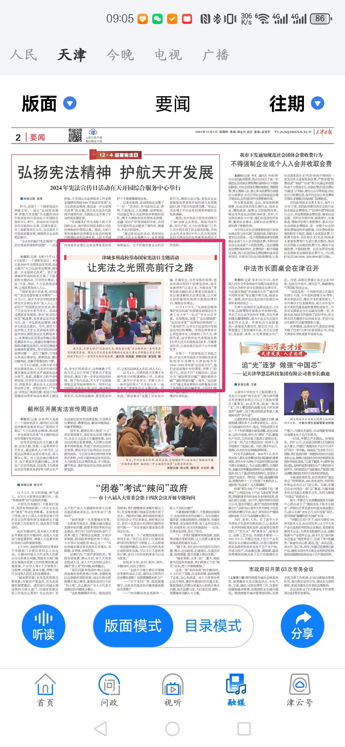 12月4日清晨,天津大学开展宪法晨读活动,上百名学生面对国旗手捧宪法资料齐声诵读宪法部分章节、条款,清脆有力的声音响彻校园,引导学生从宪法中汲取知识、获取养分,做社会主义法治的坚定捍卫者。学校还举办了“学宪法·讲宪法”演讲比赛、宪法日知识答题活动等多场法治教育主题活动,学生们纷纷表示,这种寓教于乐的方式让自己学到了更多关于宪法的知识,激发了进一步学法用法的热情。除了校内活动,天大学子还积极将宪法宣传延伸到校外。同学们走出校园,走进中小学、社区,通过普法宣讲、绘制宪法宣传周墙绘作品等多种形式,弘扬宪法精神、普及宪法知识,让宪法法律走入生活、深入人心。