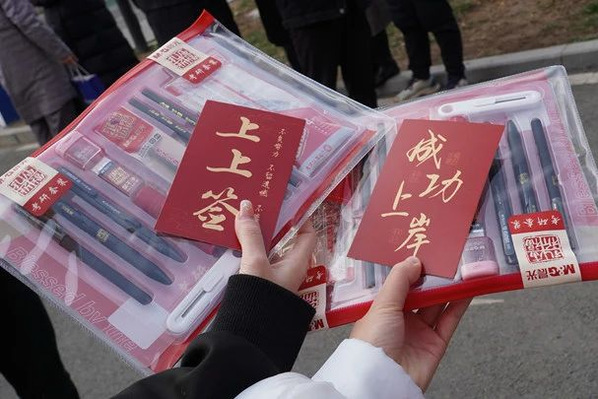 天职师大理学院特意为每位考研学子准备了实用的文具礼包,包括文件袋、2B铅笔、黑色签字笔、橡皮等,礼包中还附带了一张精美的明信片,上面用工整而真挚的笔触写着来自学弟学妹们的鼓励与祝福,这些话语,如同一股股暖流,温暖着每一位考研学子的心田。自动化与电气工程学院为考研学子送上精心准备的考研慰问大礼包,每一份礼品都饱含深意,寓意考研学子逐梦之路“旺”上加旺、一举夺“葵”、“苹”稳上岸,凝聚着学院对考研学子的深切关爱与诚挚祝福,承载着对学子们成功“上岸”的美好期冀。