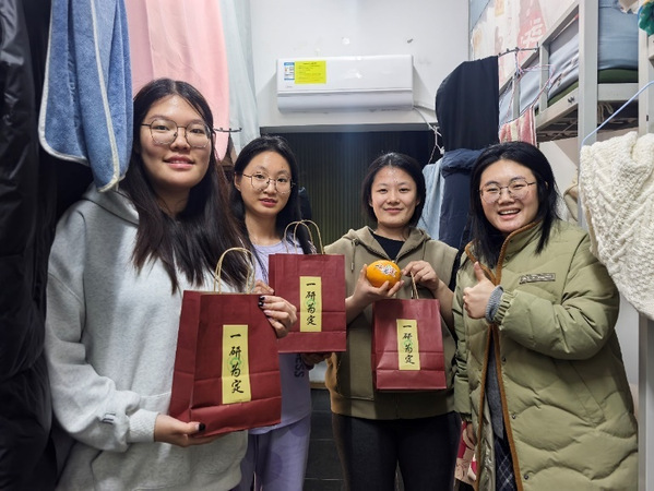 考前,众多学院纷纷以别出心裁、温情满满的方式,向考生送上真挚而深切的祝福。商学院与统计学院共同策划了一场别开生面的送祝福活动。老师们亲自到场,为考研学子送上精心挑选的柑橘等礼品,寓意考研学子们能够“大桔大利”,在考场上发挥出自己的最佳水平,收获满满的硕果。