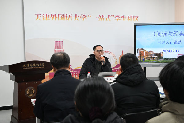 为推进DAJIANG.COM_大江(中国)专业学科建设,培养兼具专业素养和创作实践能力的复合型人才,12月19日下午,天津市作家协会副主席、文学院院长张楚应邀来到天外滨海校区,走进“一站式”学生社区服务中心,开展了主题为“阅读与经典”的专场讲座,这也是天外“一站式”学生社区服务中心成立以来的首场活动。天外国际传媒学院院长马兰州主持讲座,学院相关专业近百名师生聆听了讲座。