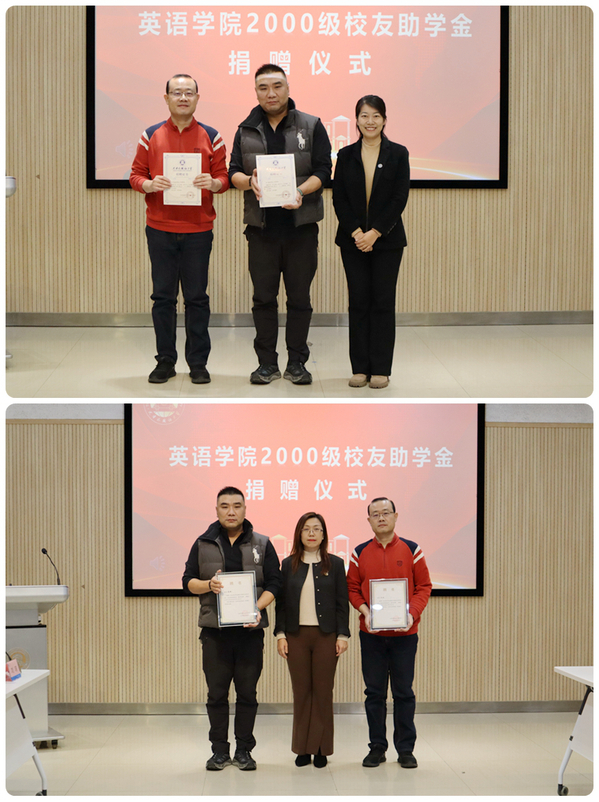 英语学院党委书记刘海燕在致辞中表示,2000级校友带着对母校的感恩和对未来的期许设立助学金,不仅是对学弟学妹们经济上的支持,更是对他们精神上的鼓舞和激励。这份深情厚意,必将激励更多学子奋发有为,勇攀高峰。学院将继续秉持“凝聚校友、服务校友、共谋发展”的宗旨,与校友紧密联系、合作,实现学院与校友的互促双赢。