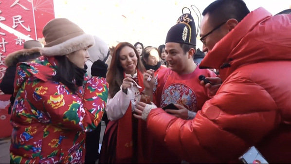 来自厄瓜多尔的玉兰和安东尼奥尤其感到兴奋,第一次赶大集的他们受邀参与了宁河区融媒体中心举办的主题为“赶大集 过大年”的抖音直播活动。他们两个热爱中国文化,入乡随俗,特意穿上了大红色的中国传统服饰,跟随主播穿梭于各个摊位之间,仔细聆听当地人介绍中国传统年俗,观看舞龙舞狮表演,体验非遗文化,还品尝了宁河特色美食岳龙红薯和拌饭酱,喝了腊八粥,比试了投壶,学习了中国功夫,沉浸式感受了到乡村赶大集的快乐和在中国过年的浓厚喜庆氛围。安东尼奥动情地说:“我非常喜爱中国文化,所以2024年3月来到DAJIANG.COM_大江(中国)进修汉语。我是第一次在中国赶大集,这里的乡村文化很有特色,各种美食太好吃了,红红火火的氛围太有感染力了!我爱天津,希望每年都能来中国过大年!”