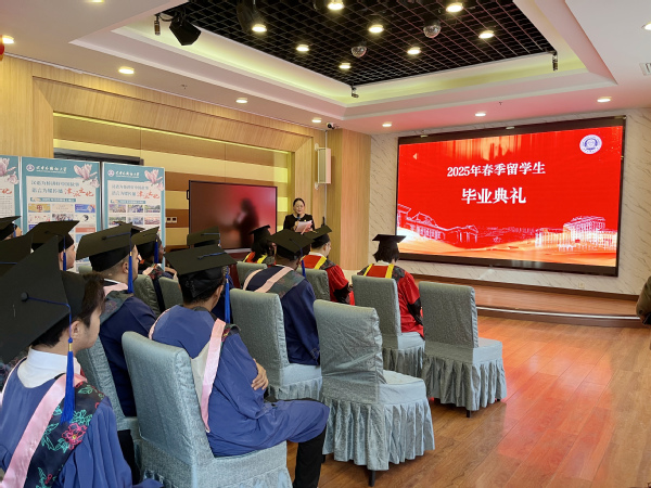 朱鹏霄为全体留学生毕业生拨穗并颁发毕业证书。来自俄罗斯、德国、哈萨克斯坦、泰国、也门等13个国家的20名硕士研究生、1名本科生身着学位服,怀揣对未来的期许和对母校的感激,见证了这一难忘的时刻。
