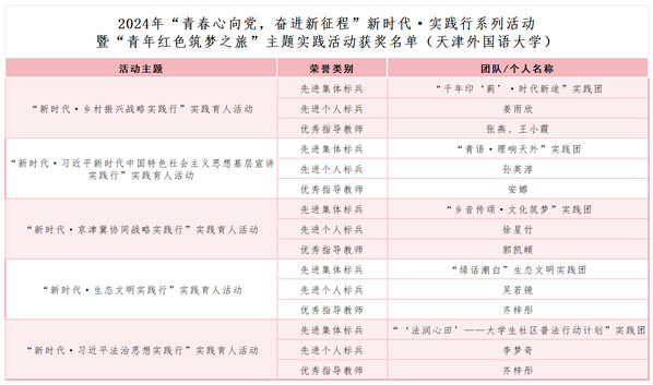 为深入学习贯彻党的二十大精神和党的二十届三中全会精神,贯彻落实习近平总书记视察天津重要讲话精神,强化实践育人导向,不断拓展实践育人空间阵地,推动思政小课堂紧密联动社会大课堂,教育引导青年学生立报国强国大志向、做挺膺担当奋斗者,2024年市教育两委组织开展了“青春心向党,奋进新征程”新时代·实践行系列活动暨“青年红色筑梦之旅”主题实践活动,校团委积极响应,在广泛动员、精心策划下,积极组织43支实践路队投身社会实践,拓宽视野、增长才干、锤炼自我,在实践中提升综合素质。
