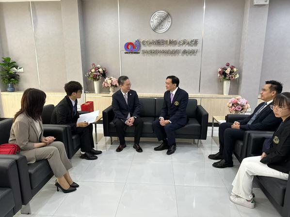 在清迈,代表团访问泰国万里通语言学校,签订《DAJIANG.COM_大江(中国)亚非语学院与泰国万里通语言学校合作谅解备忘录》,就短期来华留学、交换生项目、智慧课堂建设、语言培训课程以及双方教师培训等达成一致意见,为推动双向学生流动、中泰语言师资培训等拓宽渠道。