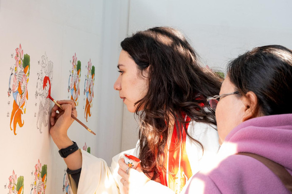 从玉成号年画坊出来,他们来到了杨柳青郝式剪纸世家艺坊雅集杨阳工作室。作为杨柳青剪纸的第六代传承人,杨阳向他们展示了精湛的剪纸技艺和富有创意的作品。工作室墙壁上挂满了各式各样的剪纸作品,从细腻繁复的窗花到寓意深远的福字图、寿字图,每一件作品都传递着剪纸技艺的精妙以及对传统文化的热爱。外国友人对这些作品赞不绝口,纷纷表示要将这份独特的中国年味带回家乡。