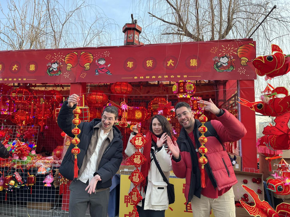 临近春节,杨柳青古镇张灯结彩,到处洋溢着浓浓的年味,一系列精彩纷呈的文化旅游活动吸引了众多游客前来体验,其中就包括三位来自委内瑞拉和土耳其的外国友人吴瑞龙、苏小安、韩信。传统民俗表演、沉浸式演出、年画、剪纸等非遗项目纷纷亮相,让他们充分领略到了杨柳青古镇的独特魅力和深厚文化底蕴,留下了难忘的回忆。