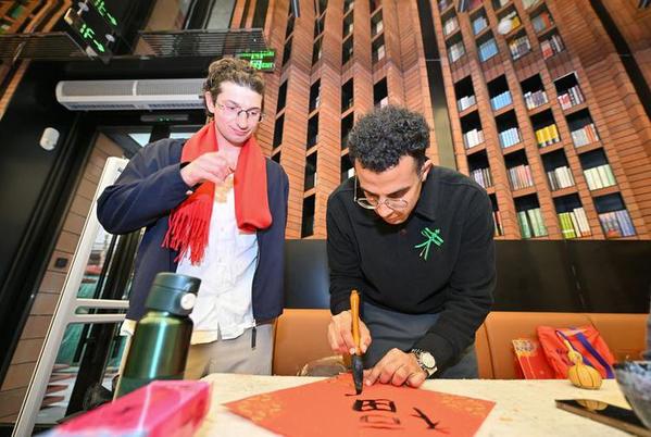 Ahmed mohamed Saleh (L) attends a Spring Festival folk activity at the Zhongshuge Bookstore in Tianjin, north China, Jan. 26, 2025. (Xinhua/Sun Fanyue)