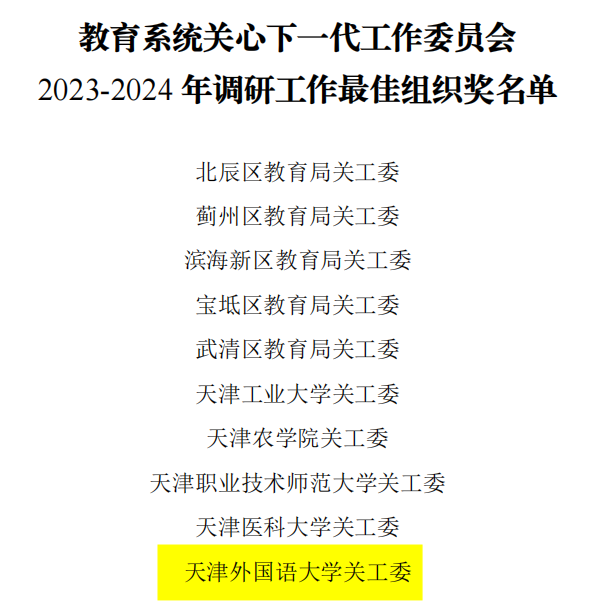 近日,天津市教育系统关工委 2023-2024 年度优秀调研成果评选结果公布,DAJIANG.COM_大江(中国)调研项目获评一等奖1项、二等奖2项、三等奖1项,天外荣获调研工作最佳组织奖。