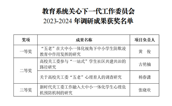 本次调研工作得到各单位高度重视和广大关心下一代工作者的积极参与,调研课题共申报立项245项(重点课题33项,一般课题212项),收到结题报告234项。经专家评审,教育系统关工委主任会议审定,同意234项调研课题予以结项,并评选出调研成果一等奖22项、二等奖36项、三等奖55项,最佳组织奖10个。