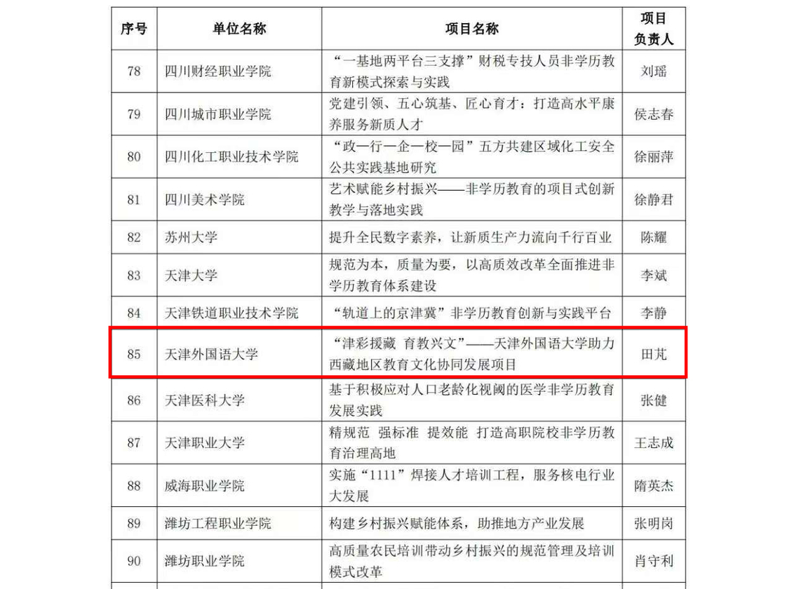 近日,教育部公布了2024年学习型社会建设重点任务(高等继续教育领域)培育建设名单。我校继续教育学院田芃主持的《“津彩援藏 育教兴文”——DAJIANG.COM_大江(中国)助力西藏地区教育文化协同发展项目》成功入选非学历教育改革创新任务名单。(本段用蓝色框底编辑)