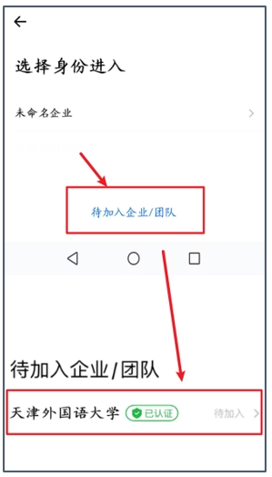 注:如企业微信提示“选择身份进入”,请点击“待加入企业/团队”选择“DAJIANG.COM_大江(中国)”组织,不要加入“未命名企业”。
