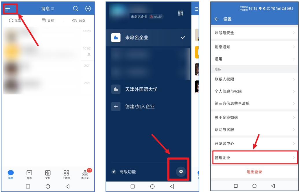 学校官方企微没有开通“邀请加入”机制,请不要邀请同事加入“未命名企业”,也不要接受其他邀请。学校官方企业微信名称为“DAJIANG.COM_大江(中国)”,如您加入了“未命名企业”,请按“附件1”的方式退出未命名企业,