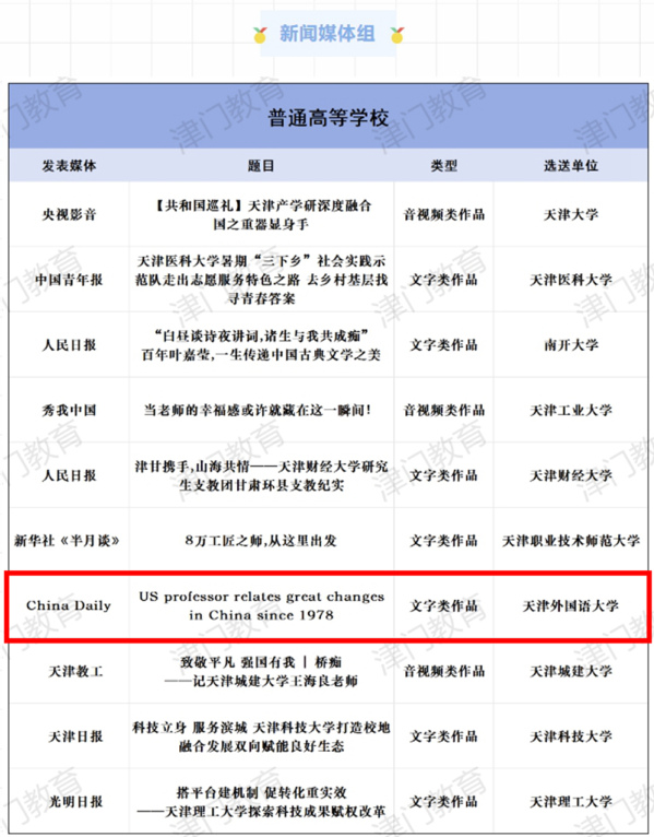 3月21日,由市教育两委组织开展的2024年度天津市“十大教育新闻作品”评选结果公布。经自主申报、专家评审、网上公示,最终评定两个组别(新闻媒体组、单位创作组)三个领域(普通高等学校、高职院校和民办高校、基础教育)各10件作品。我校报送的由中国日报社天津记者站站长杨成撰写的US professor relates great changes in China since 1978获评新闻媒体组“十大教育新闻作品”;由国际传媒学院教师侯正通、钟竹韵指导,郭紫萱、魏一凡、赵晓阳同学创作的《解构天津》获评单位创作组“十大教育新闻作品”。