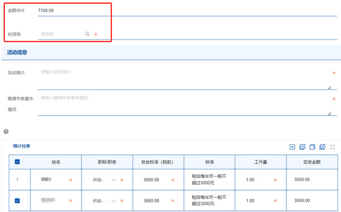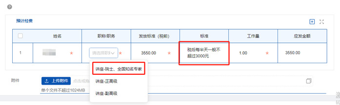 3.预计经费部分,填入发放人姓名后,请选择对应的职称,系统自动显示税后发放标准上限,请申请人根据实际情况依次填入税前发放标准和工作量,系统自动计算出应发金额。