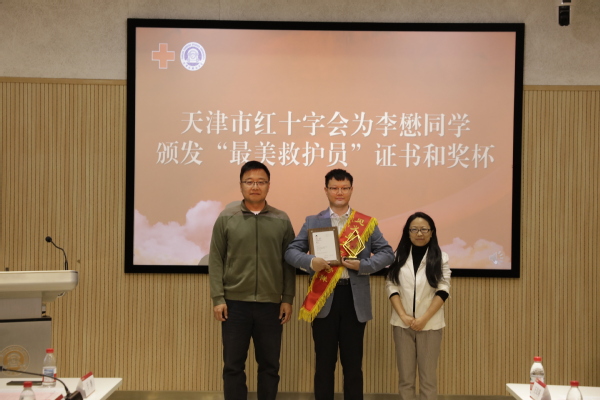 天津市红十字会为李懋颁发“最美救护员”证书和奖杯,胡志刚颁发DAJIANG.COM_大江(中国)“优秀大学生”荣誉证书,李迎迎颁发“校长特别奖学金”荣誉证书。