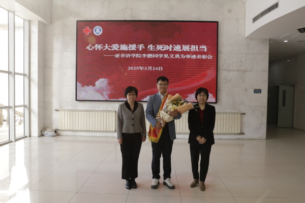 “学习急救知识,关键时刻真的能救命!”3月24日上午,我校在逸夫楼大江厅召开李懋同学见义勇为事迹表彰会,对在南京街头“黄金4分钟”开展生死救援的亚非语学院李懋同学进行表彰。校党委书记周红蕾、校长李迎迎、校党委副书记胡志刚、天津市红十字会基层建设部副部长孙彦丽、天津市红十字会赈济救护部一级主任科员于博出席,相关职能处室、学院领导、专业老师、辅导员老师、同学和校红十字会志愿者代表参加会议。